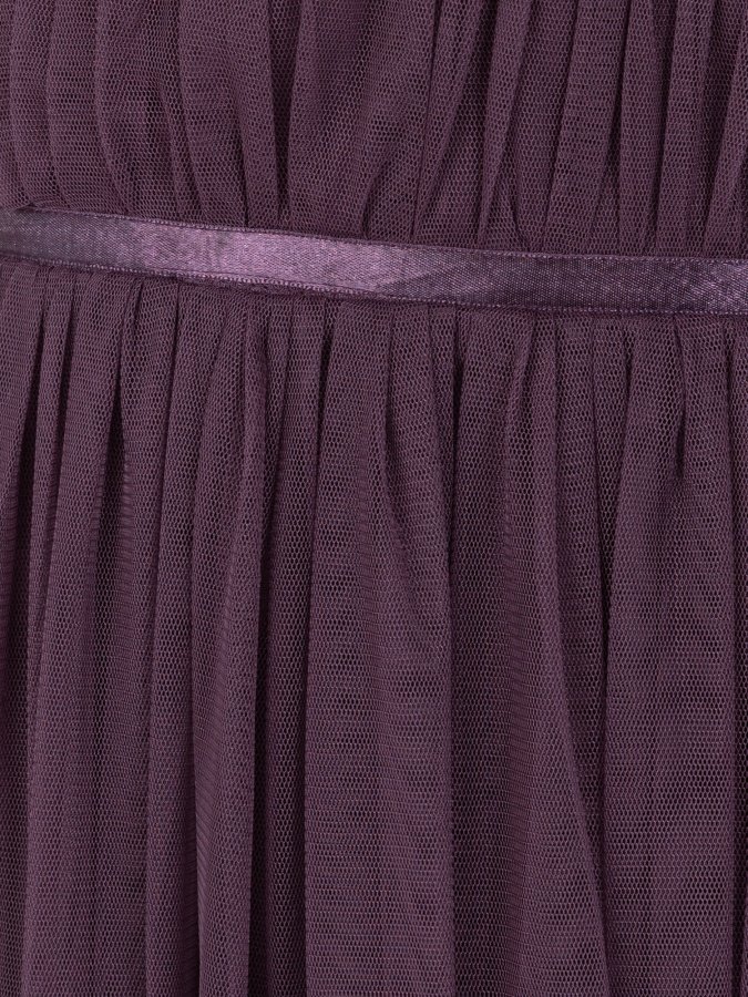 At Anaya with Love each item is consciously designed and made with 100% recycled fabric allowing you to embrace both style and sustainability. An effortlessly versatile piece tailored to complement any occasion but particularly ideal for the cherished role of bridesmaids. The bodice and midi skirt showcase a luxurious gathered tulle overlay offering a touch of ethereal charm while also embracing a romantic feel with layered sheer short sleeves. Delicate ribbon accents on the bodice not only define the waist and bust but also accentuate the A-line silhouette. Complete your look by pairing this purple midi dress with shimmering silver accessories and stylish strappy heels.