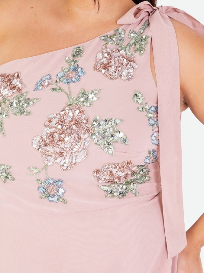 Frosted Pink Floral Embellished Self-Tie One Shoulder Maxi Dress