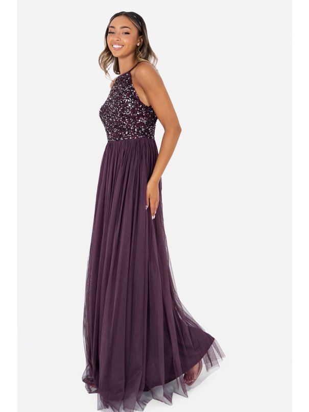 Make an entrance in this show stopping Berry maxi length evening dress. Hand sewn shimmering sequin over the halter neck fitted bodice suspended from slender straps are contrasted with the romantic tulle skirt that gently sweeps the floor as you twirl. Perfect for bridesmaids prom or evening wear styled with matching heels and shimmering clutch bag.