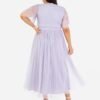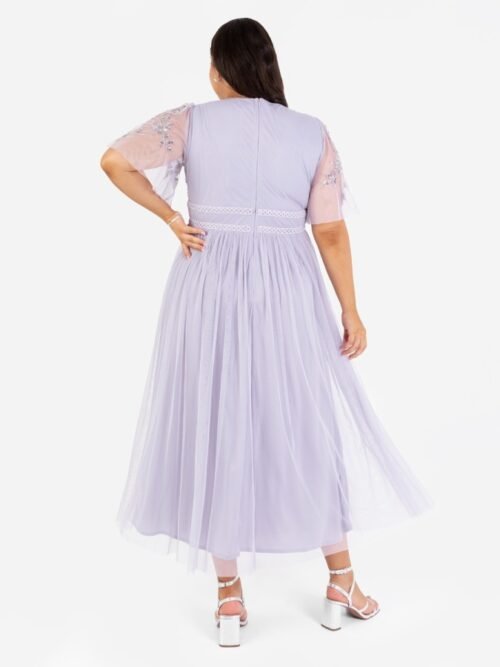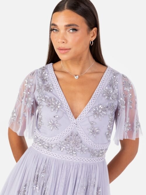 Make a dreamy entrance in this sparkly midi from Maya Deluxe. The fitted bodice is adorned with intricately sewn floral motifs enhanced by delicate sequins and beadwork offering a soft shimmer that catches the light with every movement. Framing the V-neckline and waist panel vintage-inspired embroidered borders add a timeless charm to the design. The dress’s cinched waist flows into a gathered A-line midi skirt creating a flattering silhouette that’s both graceful and modern. Embellished floral motifs continue onto the top of the skirt adding just the right amount of sparkle. Pair this piece with silver heels and shimmering jewellery to ensure your bridesmaids look as radiant as the celebration itself.